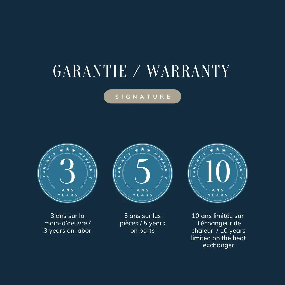 Le Thermeau Signature S65 est couvert par une garantie de 2 ans pièces et main-d'oeuvre. Notre service après-vente en Lanaudière assure le suivi de garantie directement sur place.